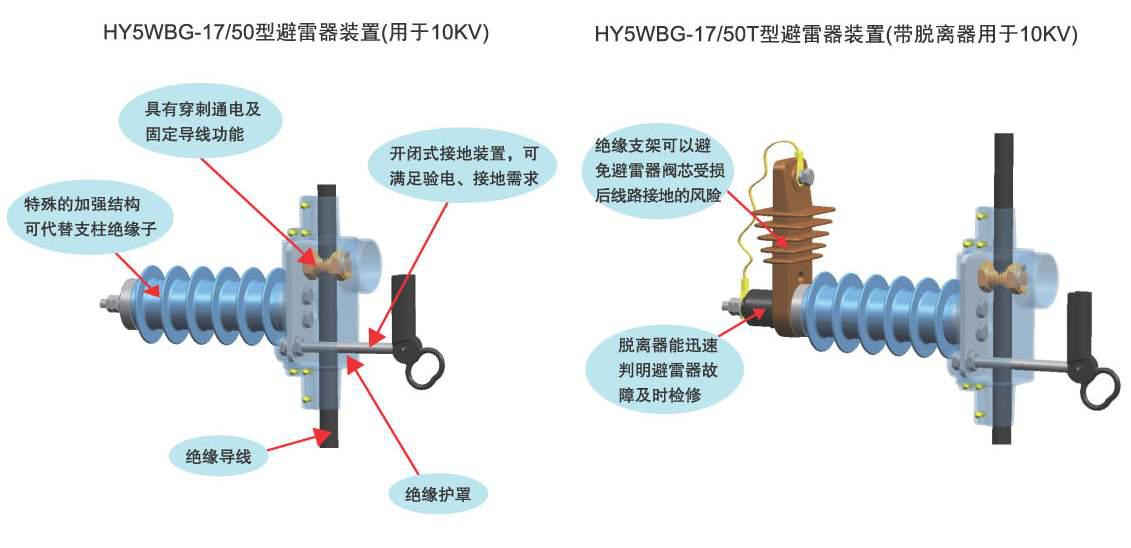 HY5WDG-17/50型氧化鋅避雷器裝置具有帶支柱功能、避雷器功能、母排接線功能、驗電接地功能的合四者功能為一體。由河間市天恒電力器材有限公司研究開發(fā),采用這種裝置同時可減少一根避雷器橫擔(因利用了本來需要的支柱橫擔),可減少下垂線固定用的三個絕緣子,也就是減少七處剝皮點,減少施工工時,同時減少六處故障點,則能達到簡化線路裝置,進一步增加運行安全可靠性的目的,使線路更加簡潔美觀。這種裝置集成了多種功能,把原需要七處剝皮點的絕緣并在一處絕緣,并且此絕緣罩設(shè)計合理,能真正做到全程絕緣,為安全和帶電作業(yè)創(chuàng)造了有利條件。