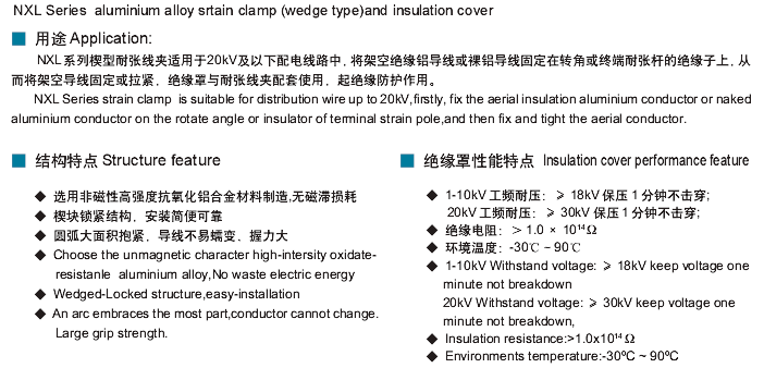 NXL(NEK)系列楔形耐張線夾,主要型號有:NEK-1,NEK-2,NEK-3,NEK-4,NEK(Z)-2,NEK(Z)-3,NEK-3B,NEK楔形鋁合金耐張線夾.絕緣罩。NXL-1,NXL-2,NXL-3,NXL-4.NXL-2J.NXL-3J,NXL-4J.