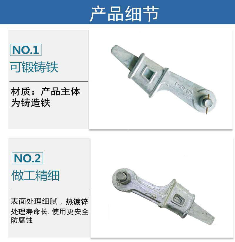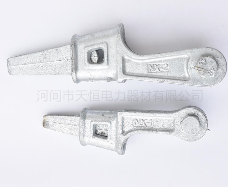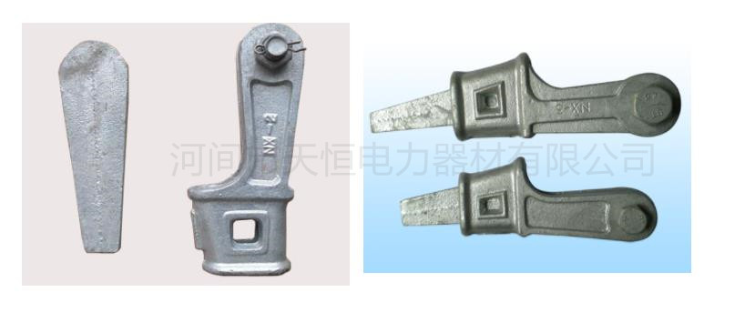 2)、錨固金具,又稱緊固金具或耐線線夾。這種金具主要用來緊固導(dǎo)線的終端,使其固定在耐線絕緣子串上,也用于避雷線終端的固定及拉線的錨固。錨固金具承擔(dān)導(dǎo)線、避雷線的全部張力,有的錨固金具變作為導(dǎo)電體