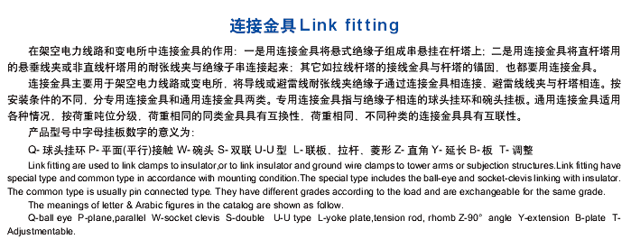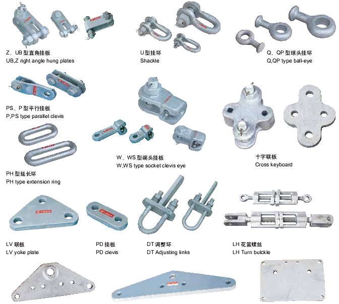 主要有:聯(lián)板,調(diào)整環(huán),十字掛板,花蘭螺絲,球頭掛環(huán),碗頭掛板,U形掛環(huán),平行掛板,掛板。直角掛環(huán),加強(qiáng)形U形掛環(huán),拉環(huán),U型螺絲,支撐架。