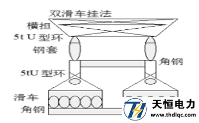 1、耐張塔邊相的滑車用U型環(huán)、Φ19.5(長(zhǎng)2m)鋼套掛在導(dǎo)線橫擔(dān)靠掛線點(diǎn)附近的主材上,掛具長(zhǎng)度以不會(huì)撞擊瓷瓶、鐵塔橫擔(dān)為好。